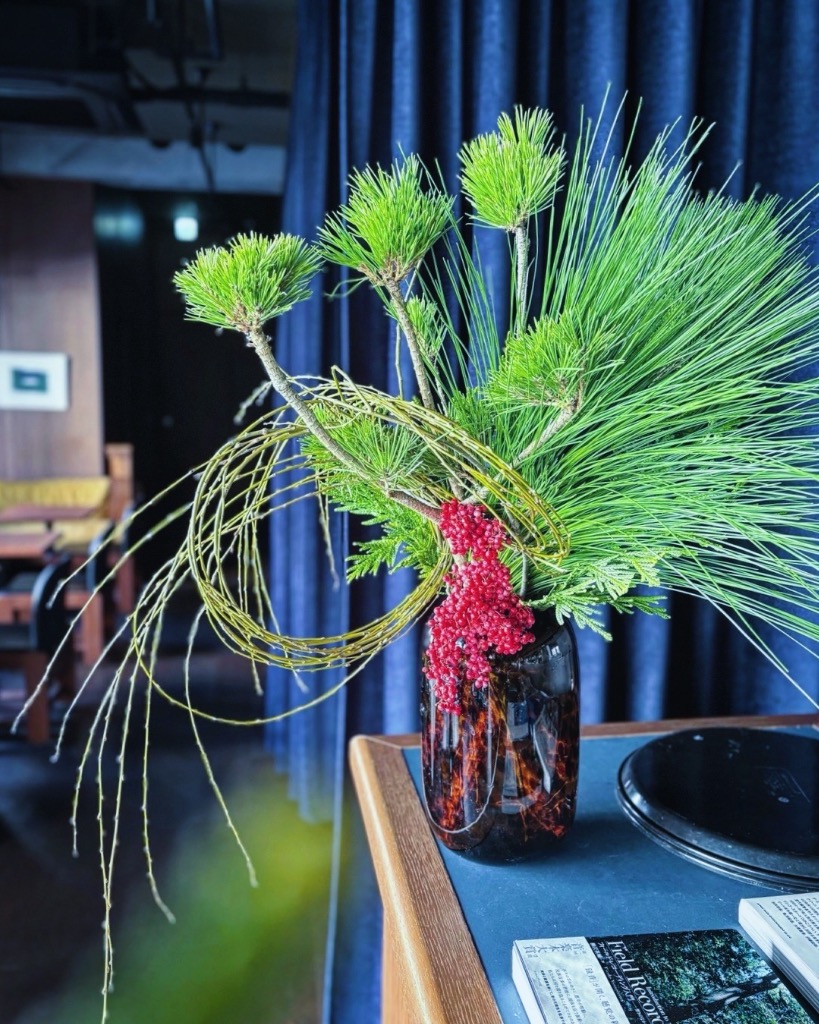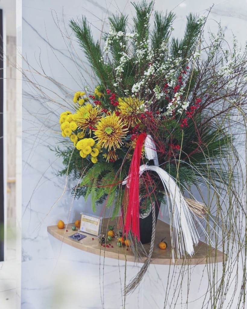 松や葉牡丹、柳などを使用し、新年に相応しいおめでたいお花をモダンにアレンジ。