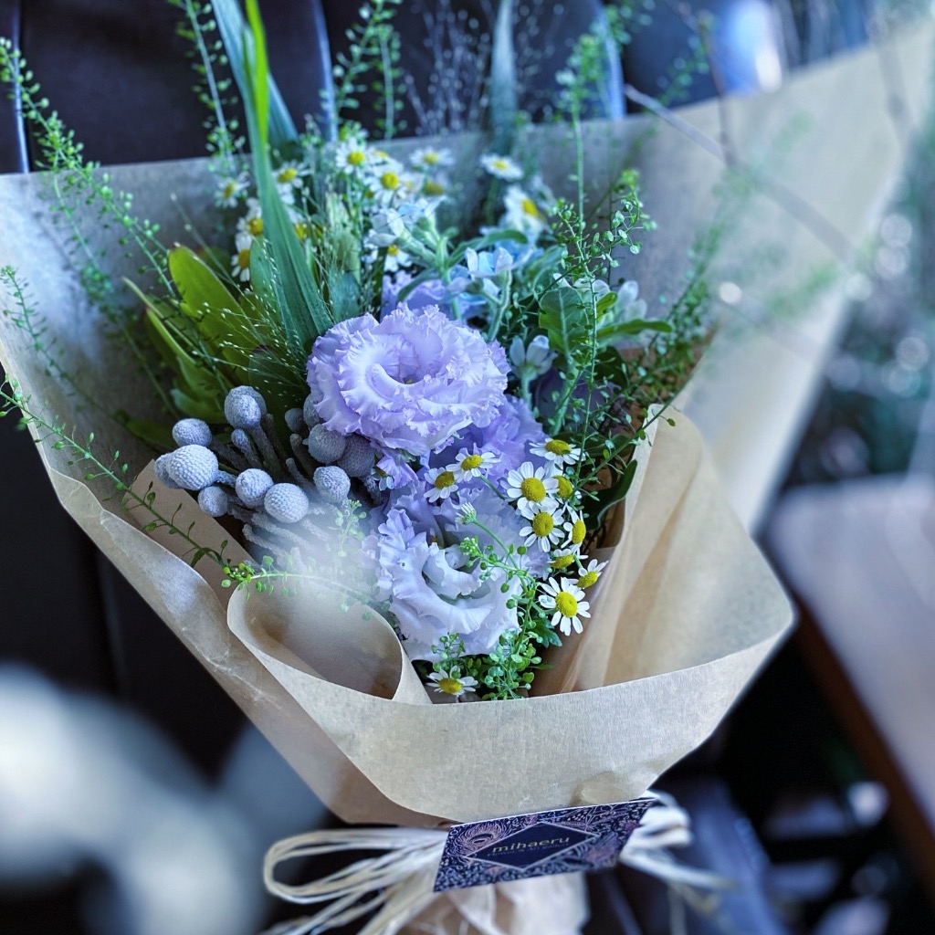 今回はナチュラルなお花を使用し清楚なお花束をご用意。
