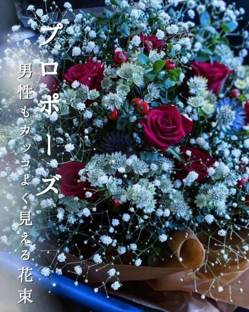 プロポーズのお花束は赤いバラを12本。お好きなかすみ草と共にドライフラワーになるお花でご用意いたしました。