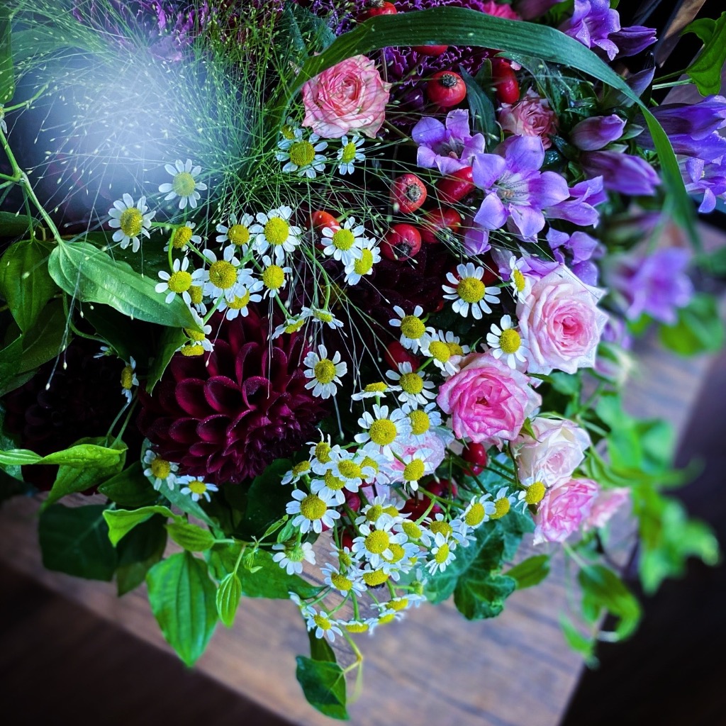 深い赤のダリアを入れて、華やかで上品さのあるアレンジメントに致しました。