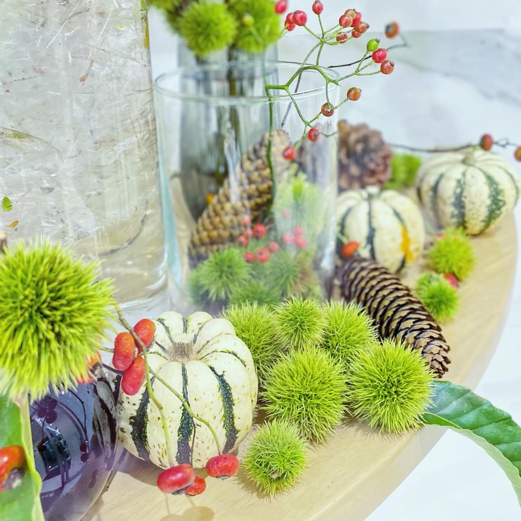 雪柳、アジサイ、野薔薇の実、カボチャ(恐竜の卵)、栗、ローズヒップなど。