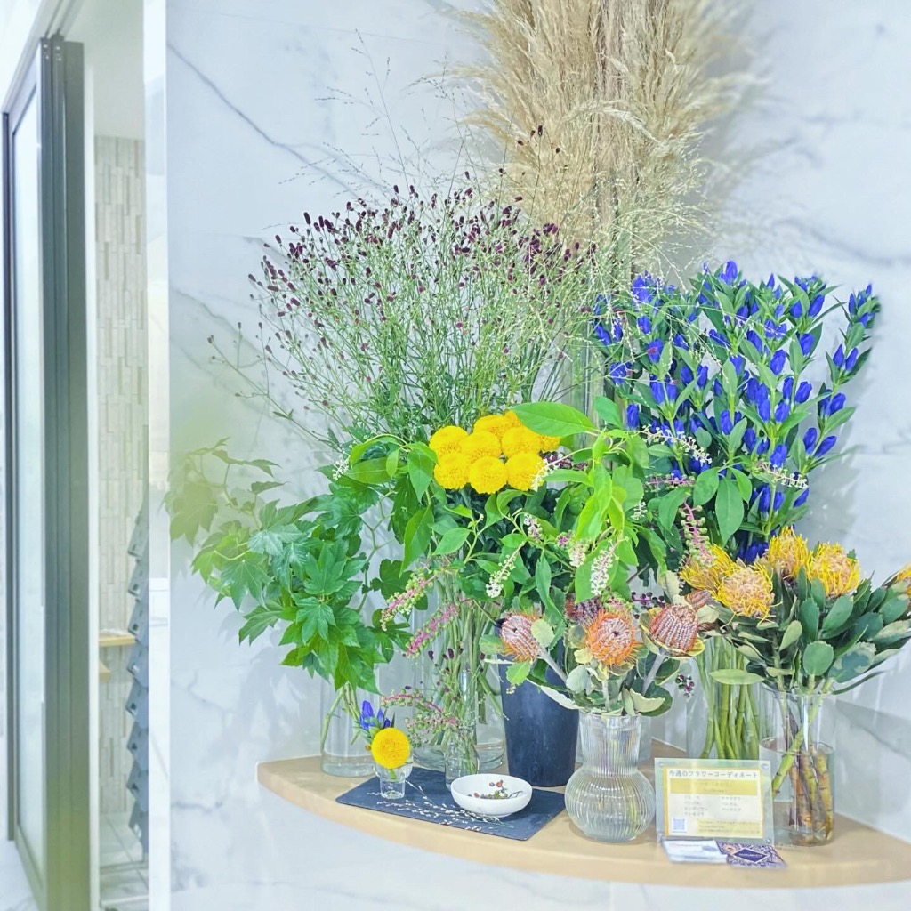 パンパス、ピンポンマム、ワレモコウ、リンドウ、バンクシア、ピンクッション、山ごぼうなどなど。