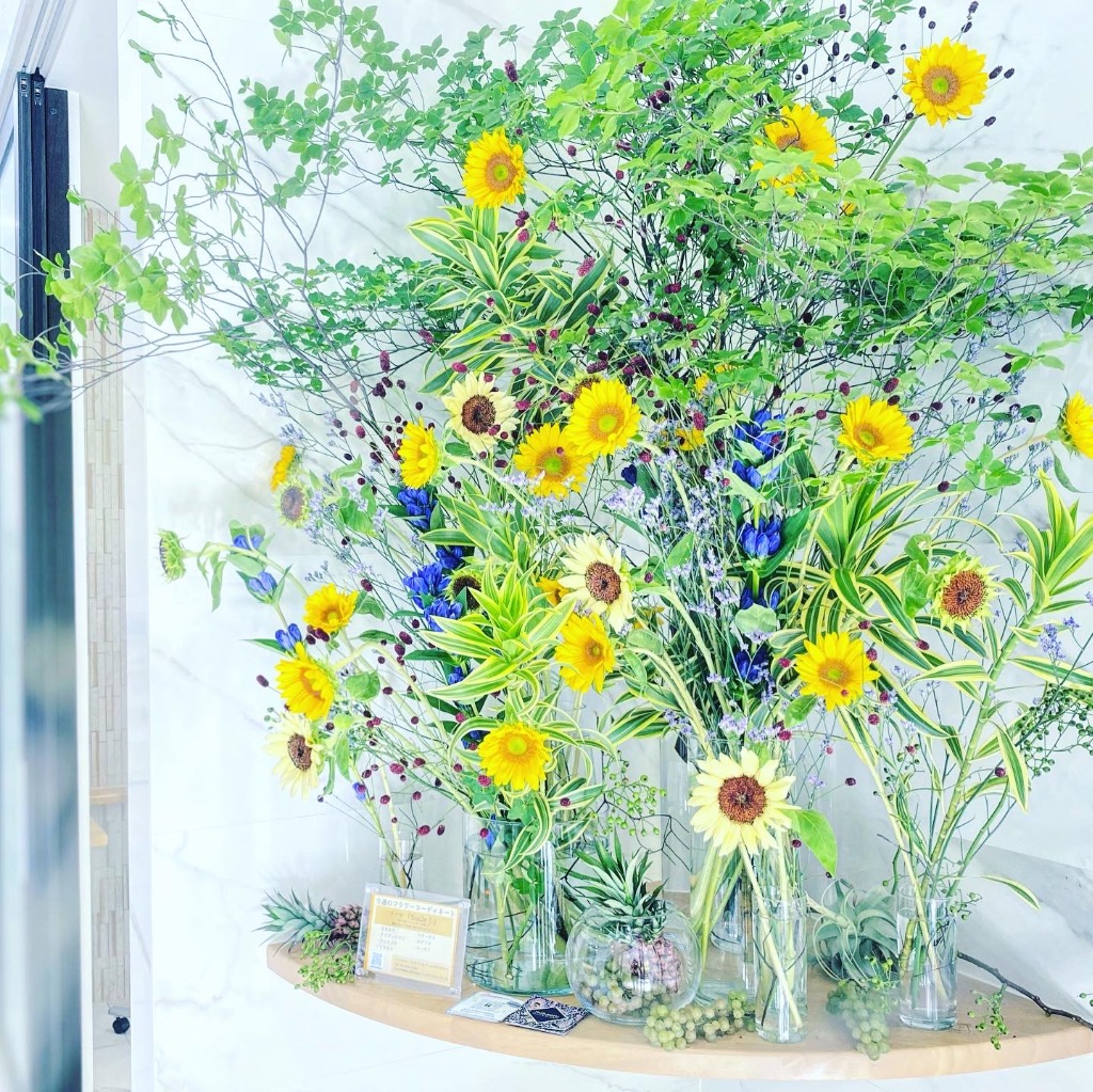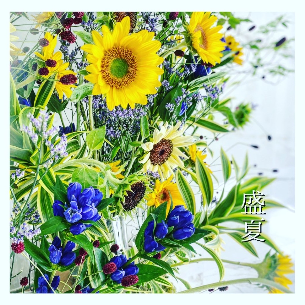 ドウダンツツジ、ワレモコウ、リンドウ、ドラセナなどで盛夏の輝きを表現✨