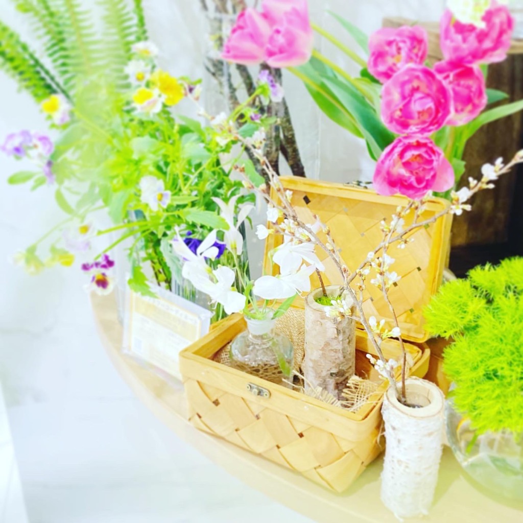 桜やチューリップ、パンジーや宿根スイートピーなどを使い、お花見を表現致しました🌸✨